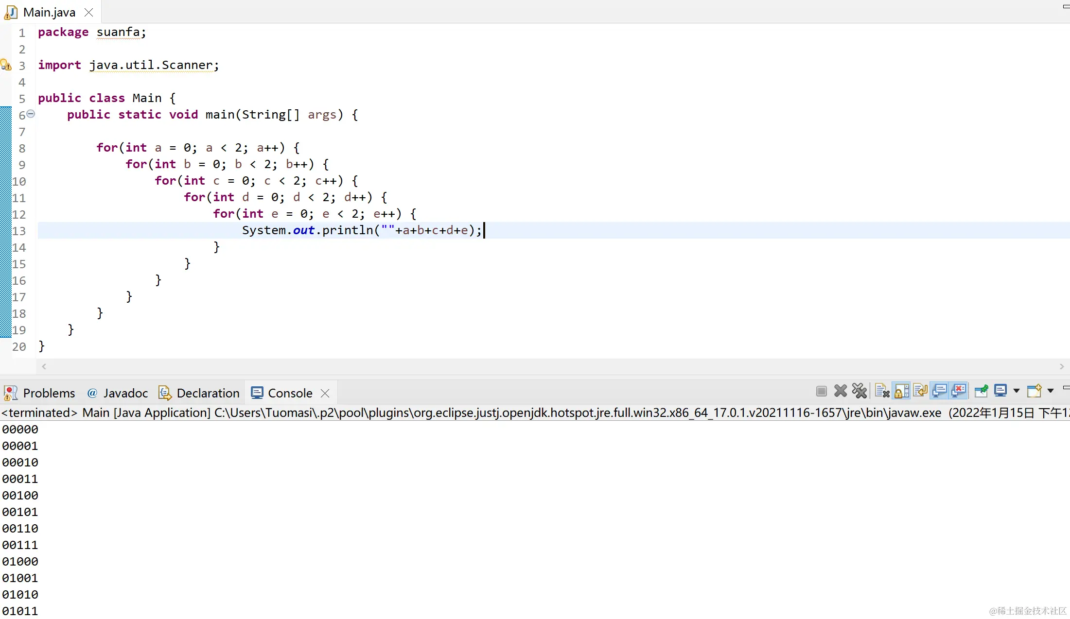 输出32行,按从小到大的顺序每行一个长度为5的01串。