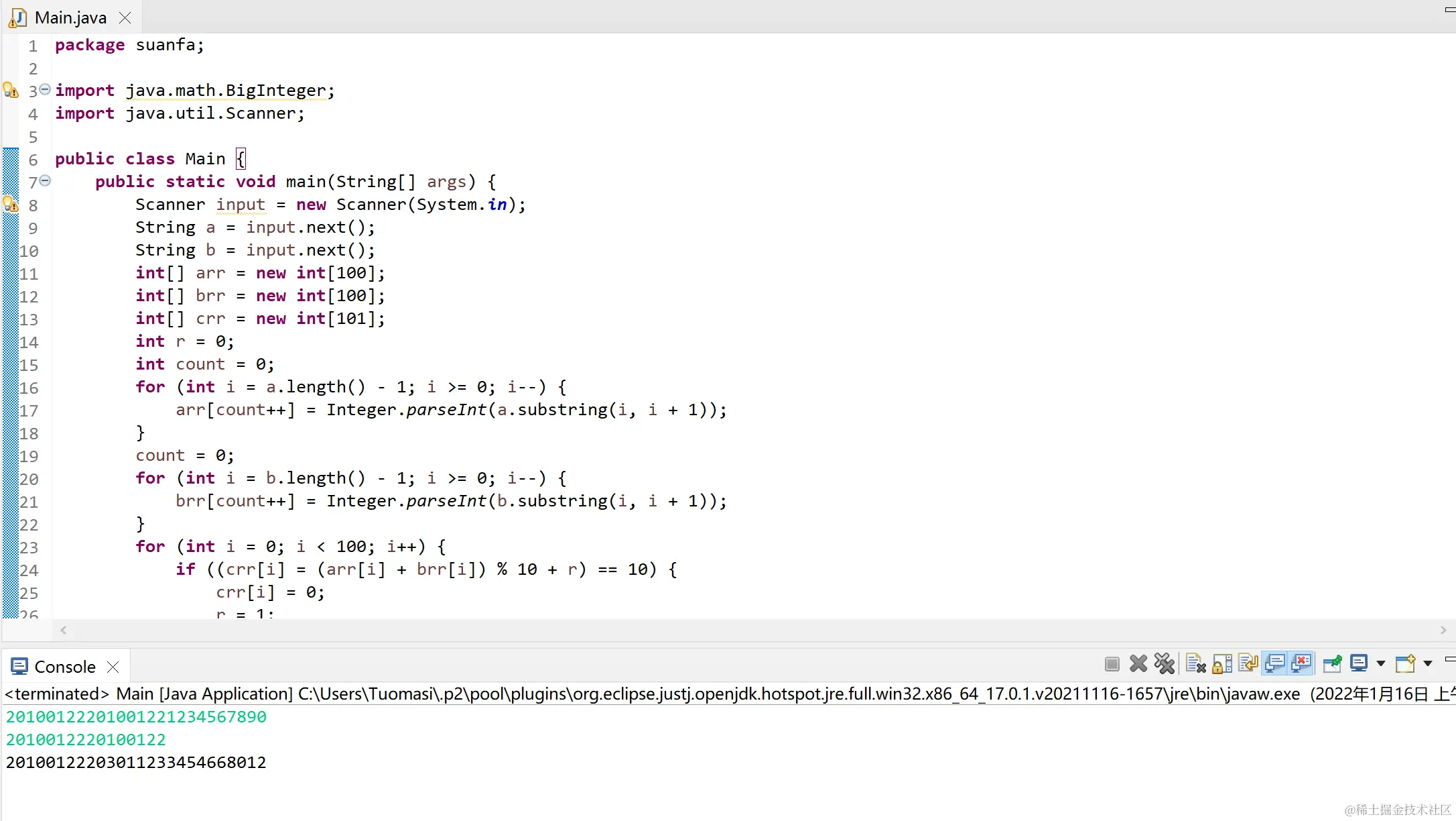 最后将C输出即可。输入包括两行,第一行为一个非负整数a,第二行为一个非负整数b。两个整数都不超过100位,两数的最高位都不是0。