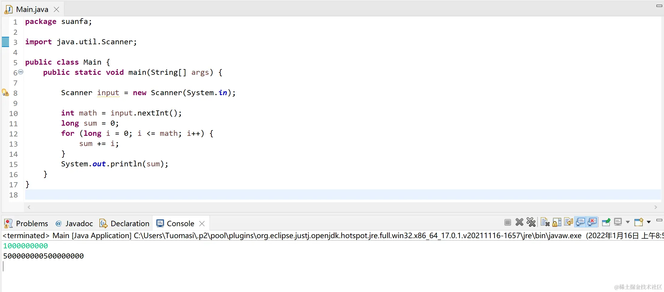本题直接的想法是直接使用一个循环来累加,然而,当数据规模很大时,这种“暴力”的方法往往会导致超时。此时你需要想想其他方法。你可以试一试,如果使用1000000000作为你的程序的输入,你的程序是不是能在规定的上面规定的时限内运行出来。