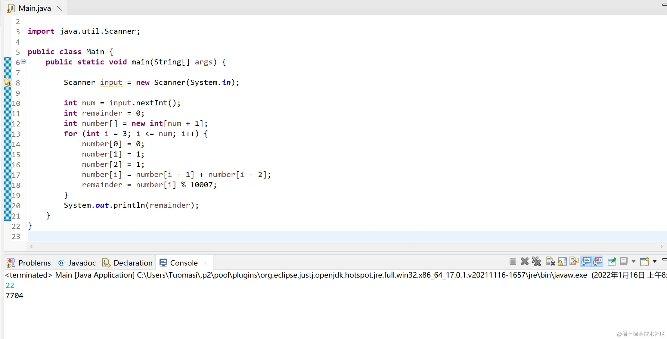 说明:在本题中,答案是要求Fn除以10007的余数,因此我们只要能算出这个余数即可,而不需要先计算出Fn的准确值,再将计算的结果除以10007取余数,直接计算余数往往比先算出原数再取余简单。