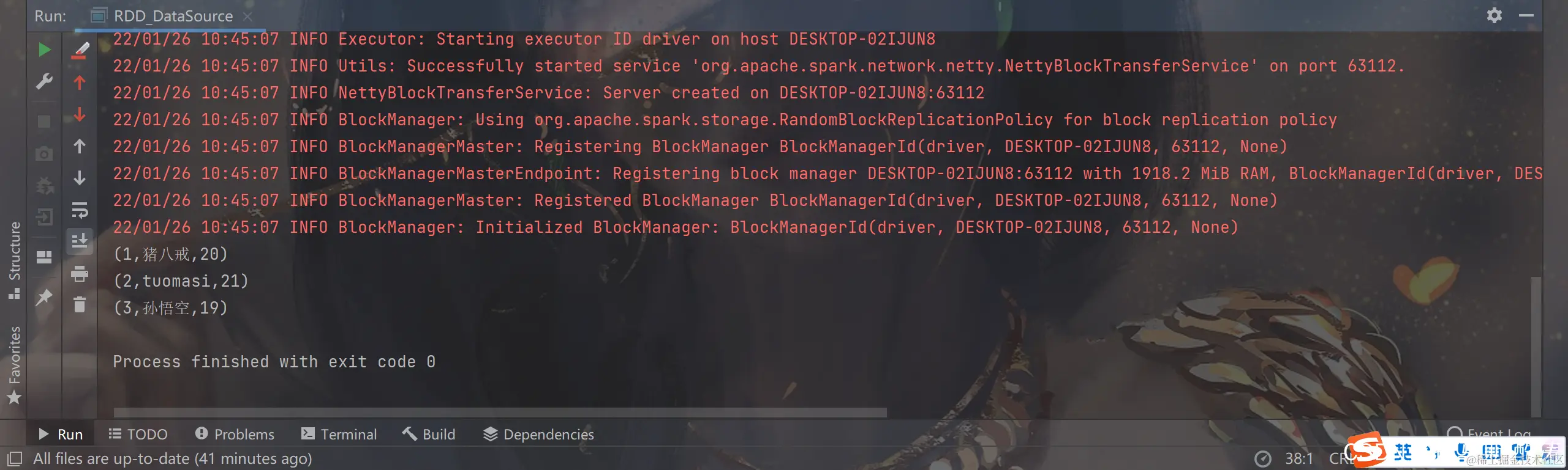 val dataRDD: RDD[(String, Int)] = sc.makeRDD(List(("tuomasi", 21), ("孙悟空", 19), ("猪八戒", 20)))