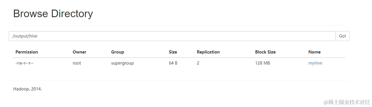 -rw-r--r-- 2 root supergroup 64 2022-03-05 22:19 /output/hive/myhive