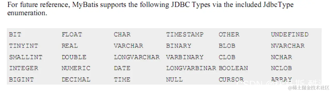 jdbcType=数据类型名称 } javaType, jdbcType 的类型 MyBatis 可以检测出来,一般不需要设置。常用格式 #{ property }