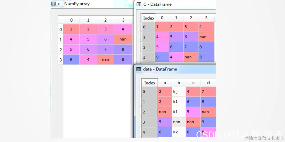 c=np.array([[1,2,3,4],[4,5,6,np.nan],[5,6,7,8],[9,4,np.nan,8]]) #数组c