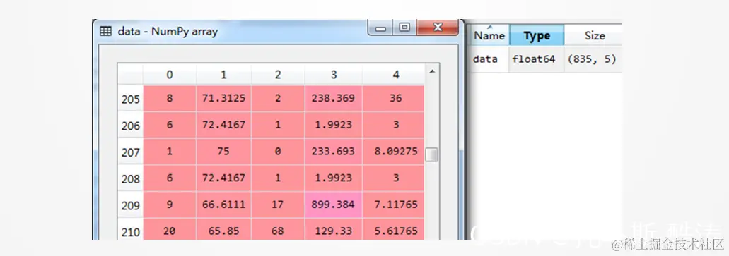 在介绍规范化方法之前,先将待规范化数据文件读入Python中。该数据文件在本书案例资源包中,它是一个Python格式的二进制数据文件,文件名为“data.npy”,可以采用Numpy包中的load函数读取,示例代码如下:
