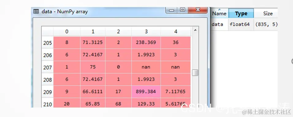 从图中可以看出,数据存在空值(NAN值),在进行规范化之前需要先对其进行填充处理,这里采用按列均值填充策略进行填充,示例代码如下: