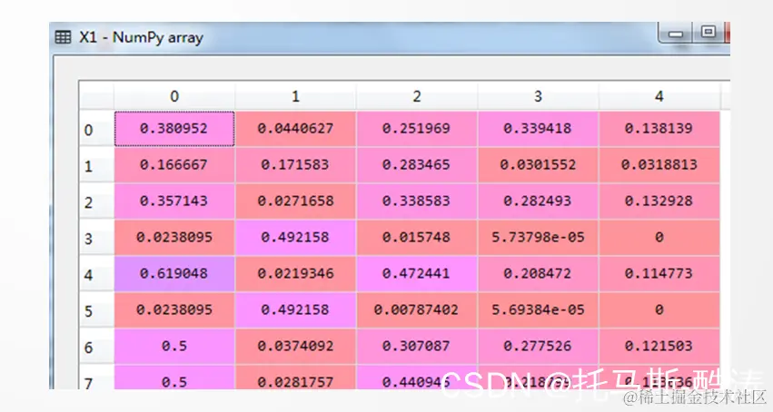 如图所示为填充后的数据,其变量名仍然为data。为了区分,记X=data,X1=data,对X作均值-方差规范化处理,对X1作0-1规范化处理。下面分别对两种规范化方法进行介绍。