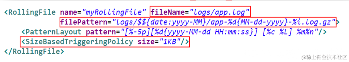 fileName 指定存放目录及第一个日志文件名。filePattern 指定新创建的日志文件的文件名。本例还会对文件进行压缩。