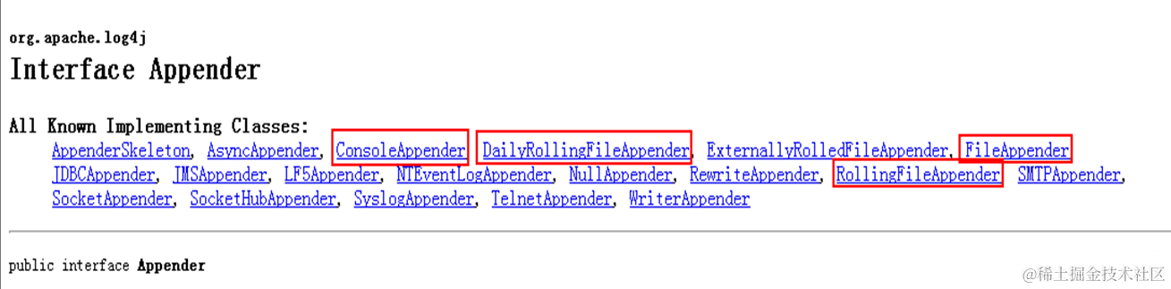 输出位置为 log4j 指定的类型,是定义好的一些 appender 接口的实现类。查看 log4j 框架解压目录下的站点目录 site 的 index.jsp 中的 JavaDoc,可看到 log4j 的 API。