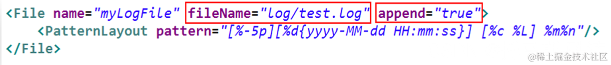 <File/>标签的 fileName 属性用于设置文件的文件保存路径及文件名。如本例的意思是, 日志文件名为 test.log,将其存放在当前项目的根目录下的 log 子目录中。