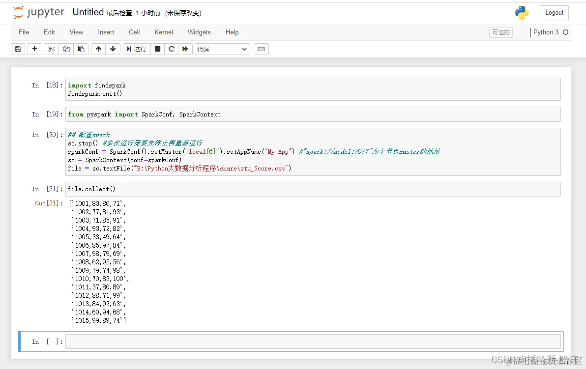 file = sc.textFile("E:\Python大数据分析程序\share\stu_Score.csv")