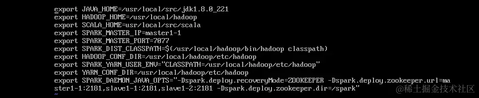 vi spark-env.shexport JAVA_HOME=/usr/local/src/jdk1.8.0_221 export HADOOP_HOME=/usr/local/hadoop export SCALA_HOME=/usr/local/src/scala export SPARK_MASTER_IP=master1-1 export SPARK_MASTER_PORT=7077 export SPARK_DIST_CLASSPATH=$(/usr/local/hadoop/bin/hadoop classpath) export HADOOP_CONF_DIR=/usr/local/hadoop/etc/hadoop export SPARK_YARN_USER_ENV="CLASSPATH=/usr/local/hadoop/etc/hadoop" export YARN_CONF_DIR=/usr/local/hadoop/etc/hadoop export SPARK_DAEMON_JAVA_OPTS="-Dspark.deploy.recoveryMode=ZOOKEEPER -Dspark.deploy.zookeeper.url=master1-1:2181,slave1-1:2181,slave1-2:2181 -Dspark.deploy.zookeeper.dir=/spark"