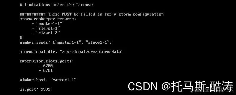 # Zookeeper集群的主机列表 storm.zookeeper.servers: - "master1-1" - "slave1-1" - "slave1-2" # Nimbus的节点列表 nimbus.seeds: ["master1-1", "slave1-1"] # Nimbus和Supervisor需要使用本地磁盘上来存储少量状态(如jar包,配置文件等) storm.local.dir: "/usr/local/src/storm/data" #workers进程的端口,每个worker进程会使用一个端口来接收消息 supervisor.slots.ports: - 6700 - 6701 #指定storm集群中的nimbus节点所在的服务器 nimbus.host: "master1-1" #web页面端口号 ui.port: 9999注:文件内容的格式一定要注意,冒号后有空格,格式错误,进程是启动不了的