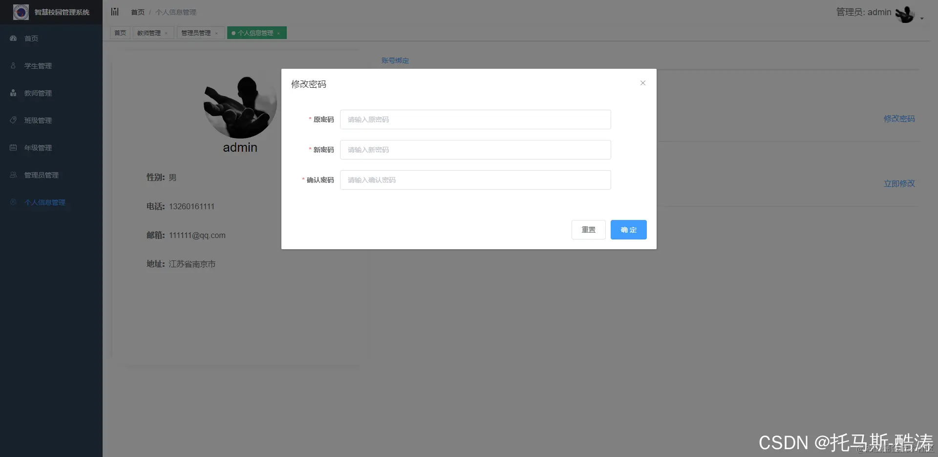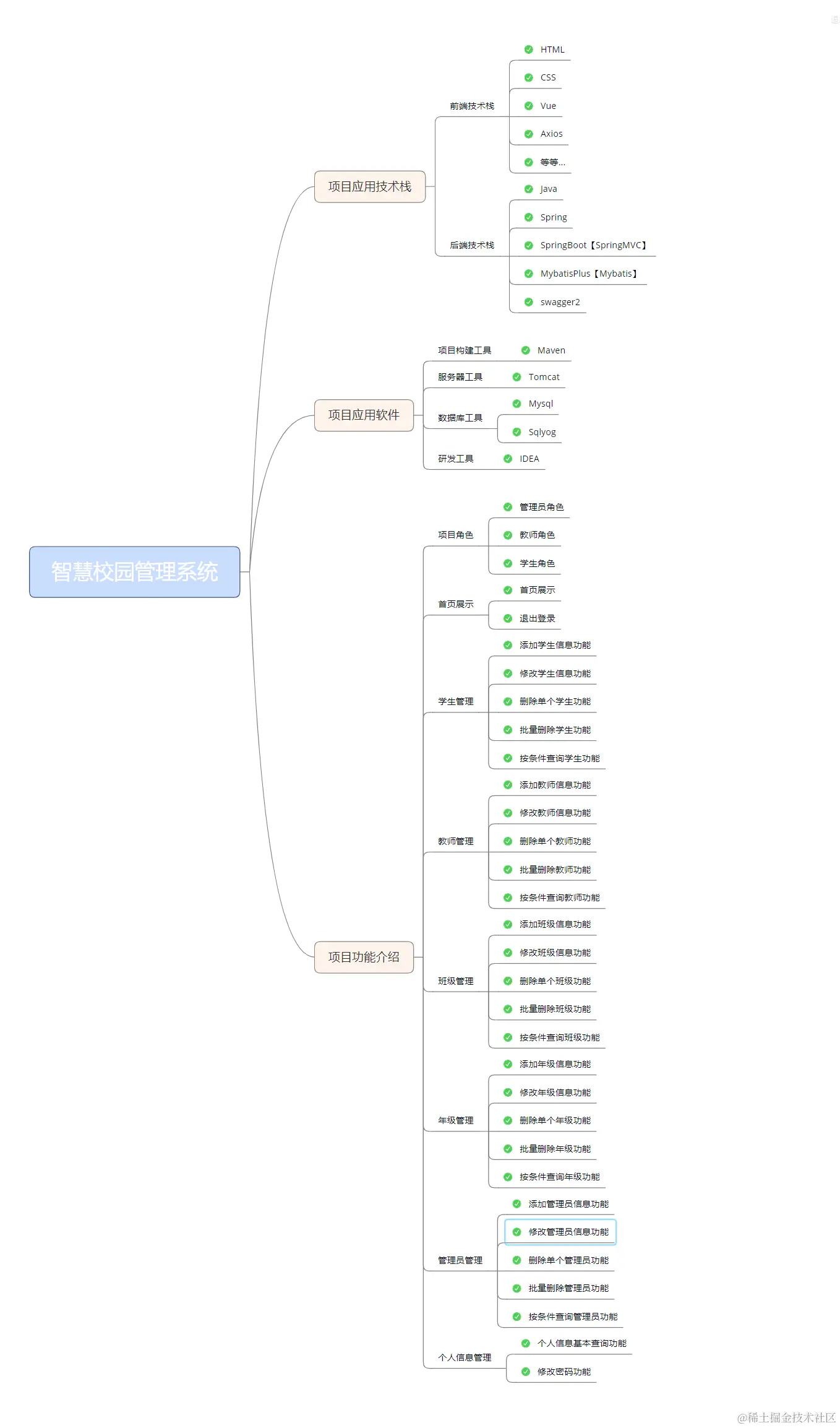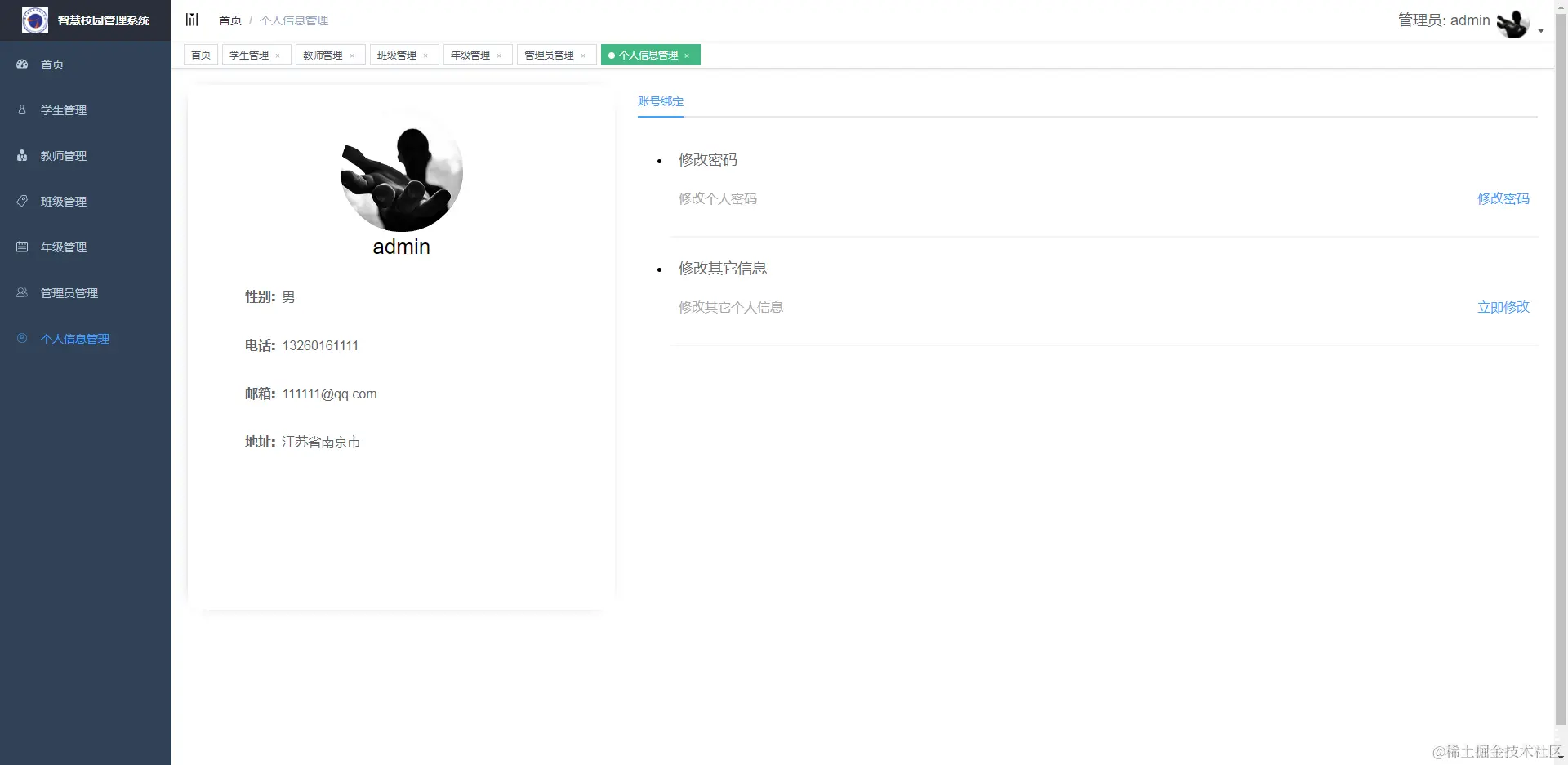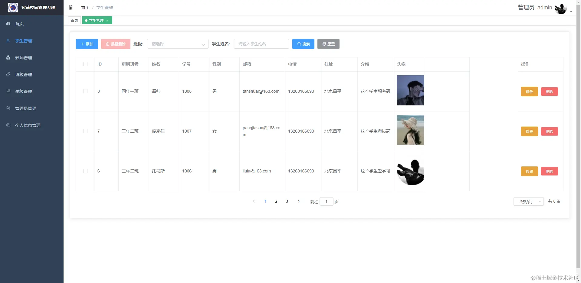 智慧校园管理系统:主要是以年级、班级为单位,进行老师和学生信息记录和统计功能。项目采用前后端分离架构思想,前端采用HTML+CSS+VUE来实现页面效果展示,后端采用SpringBoot+MybatisPlus框架实现数据存储等服务。存储层使用高性能的MySQL,服务器使用SpringBoot内置的Tomcat7.x,项目构建工具使用Maven来管理jar包和项目构建。
