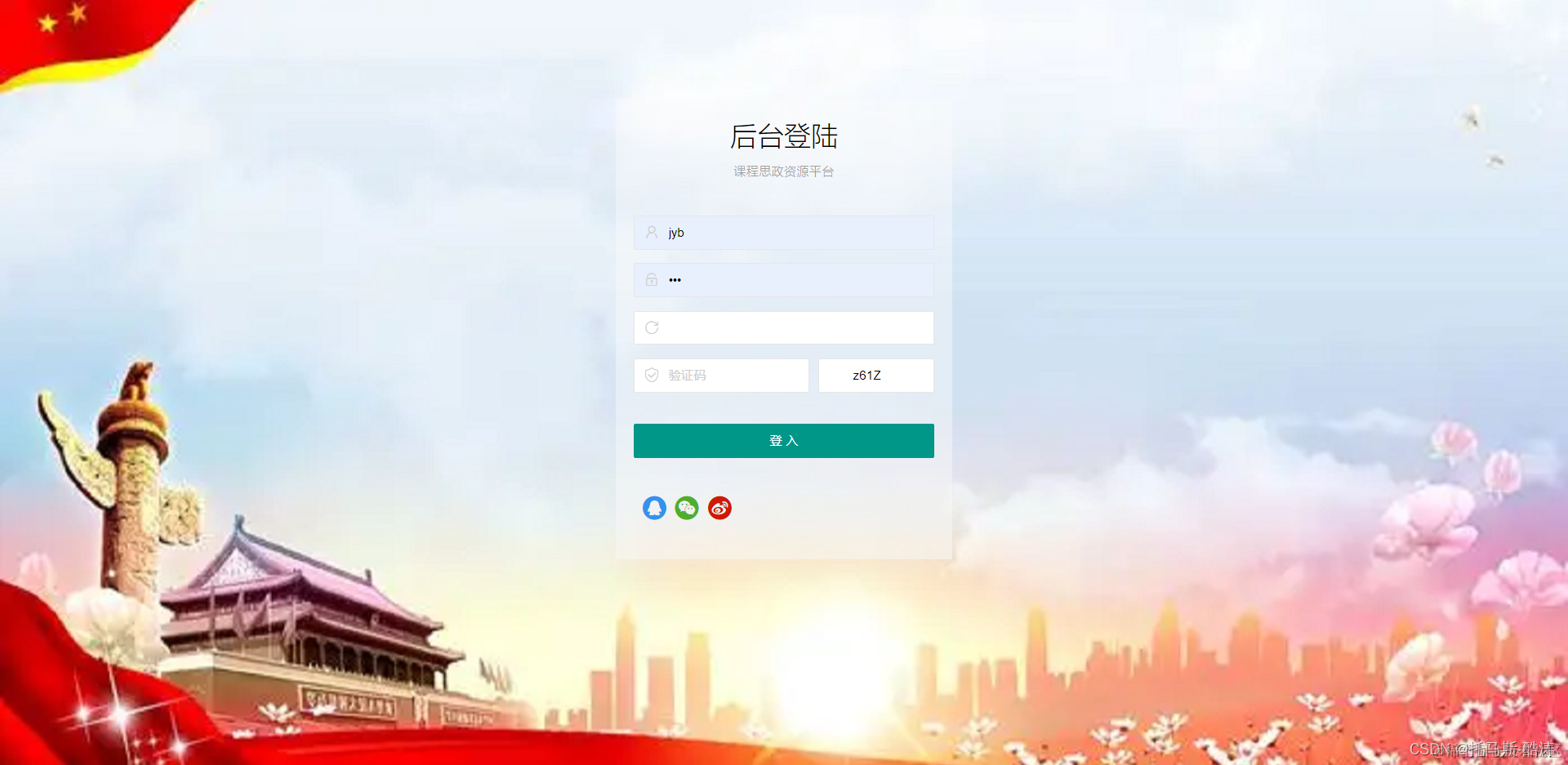 (1)登录,管理员使用思政资源平台功能的前提是使用个人账号登录系统,在登录过程中需要输入管理员的账号、密码以及随机验证码。