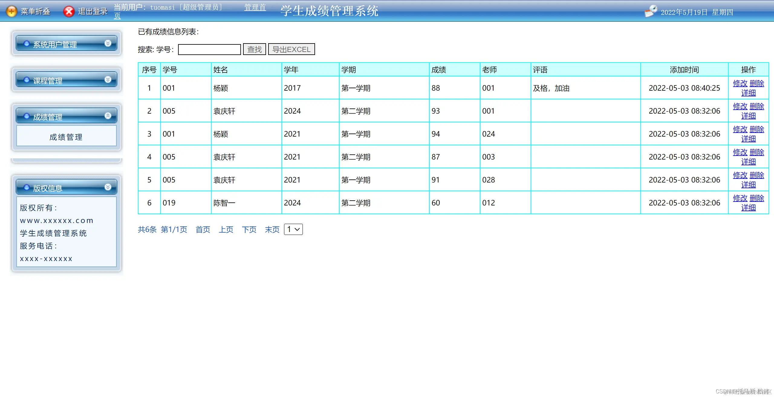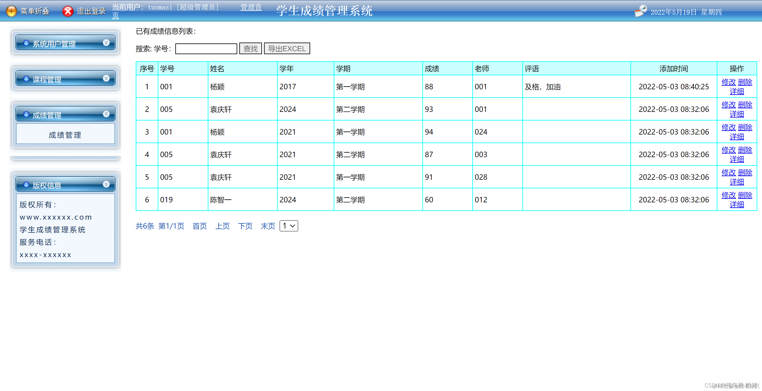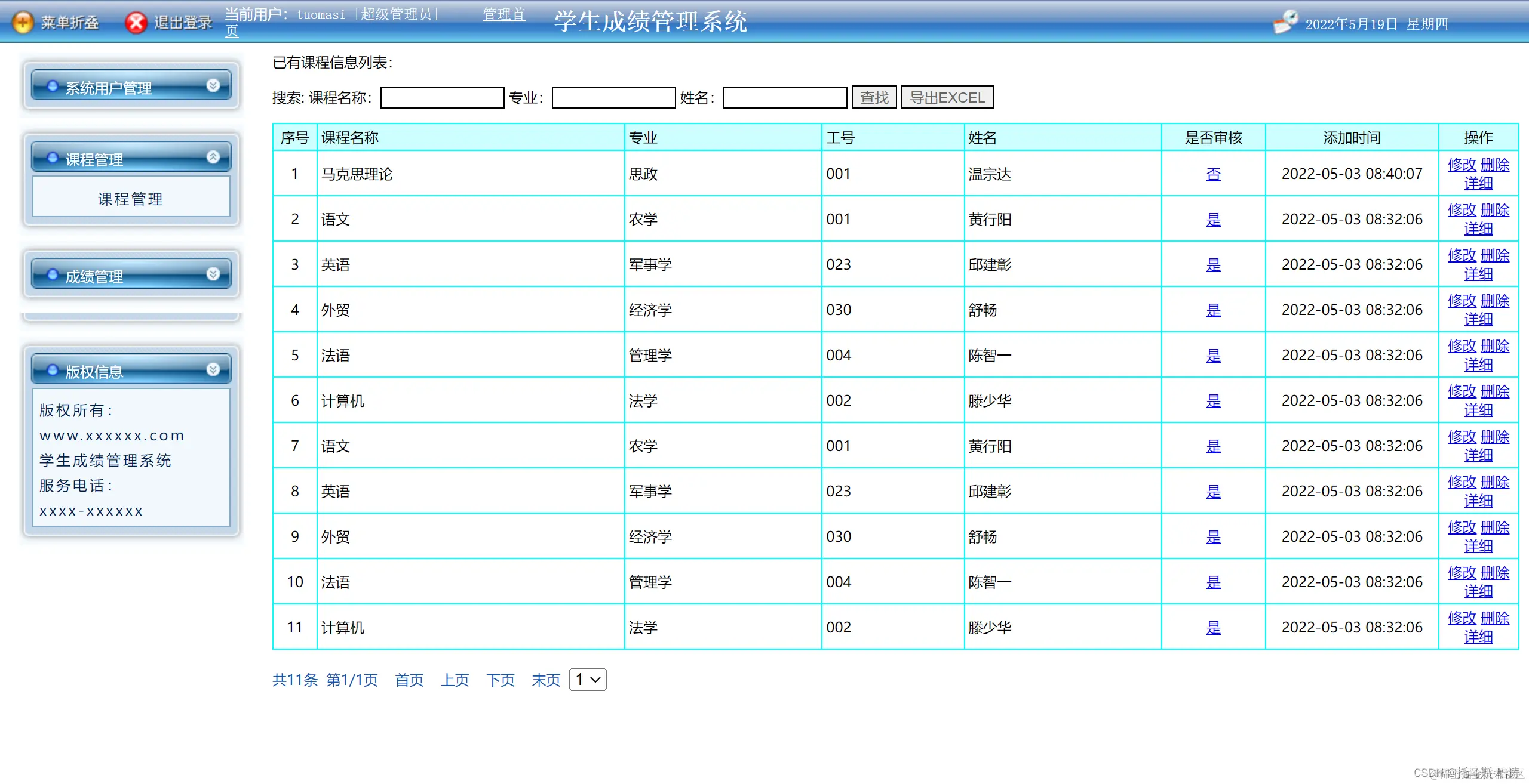 成绩管理:对学生成绩的curd,模糊查询,导出excel等操作。