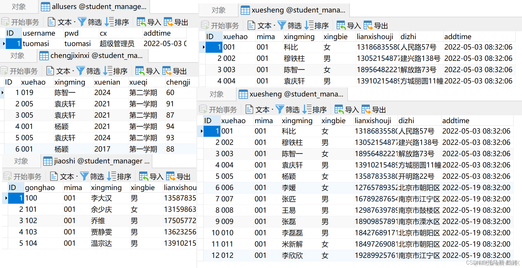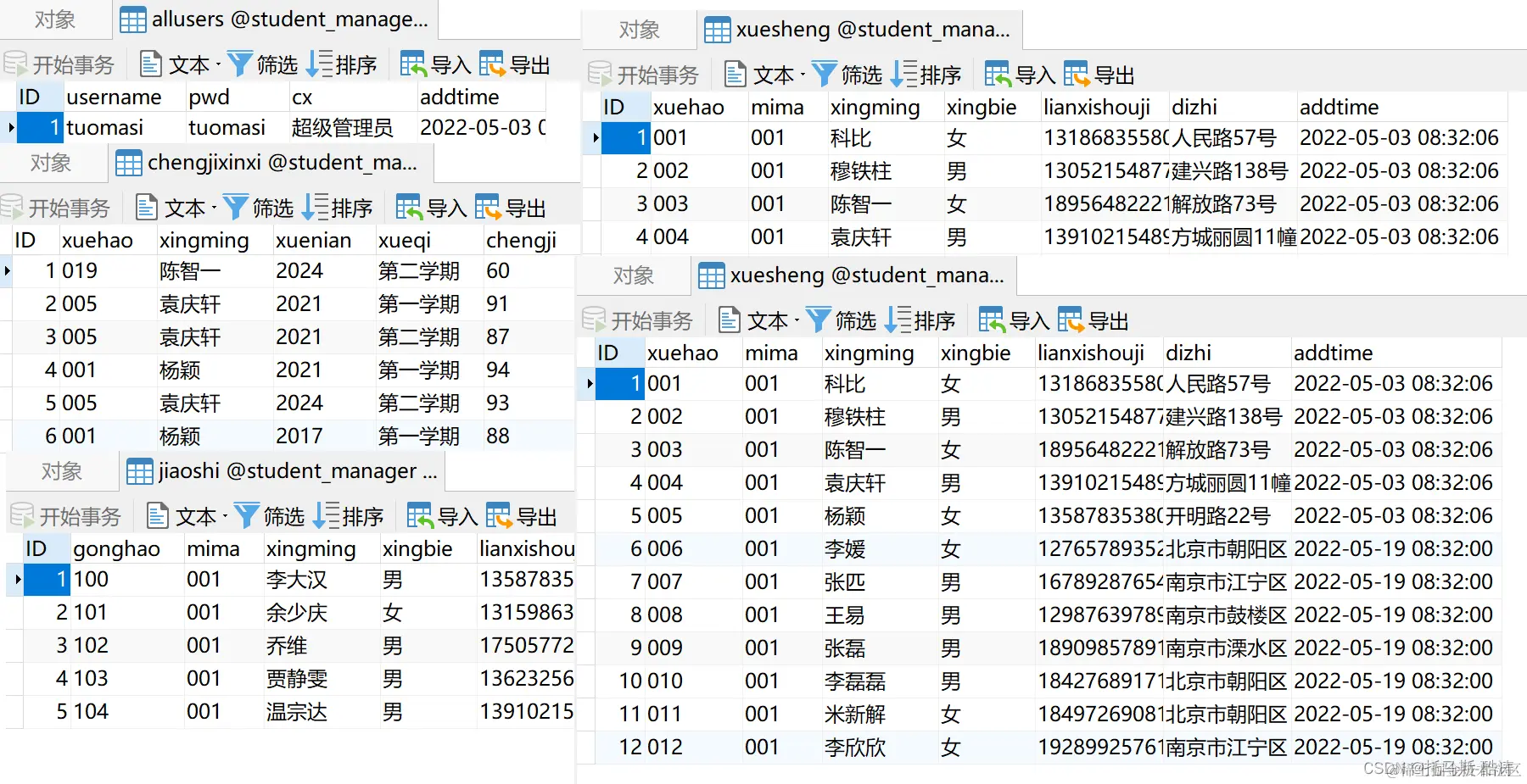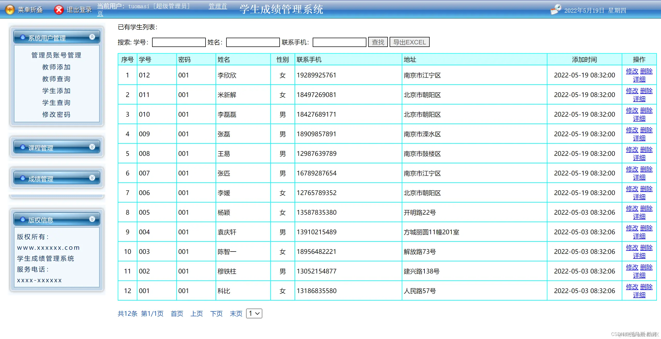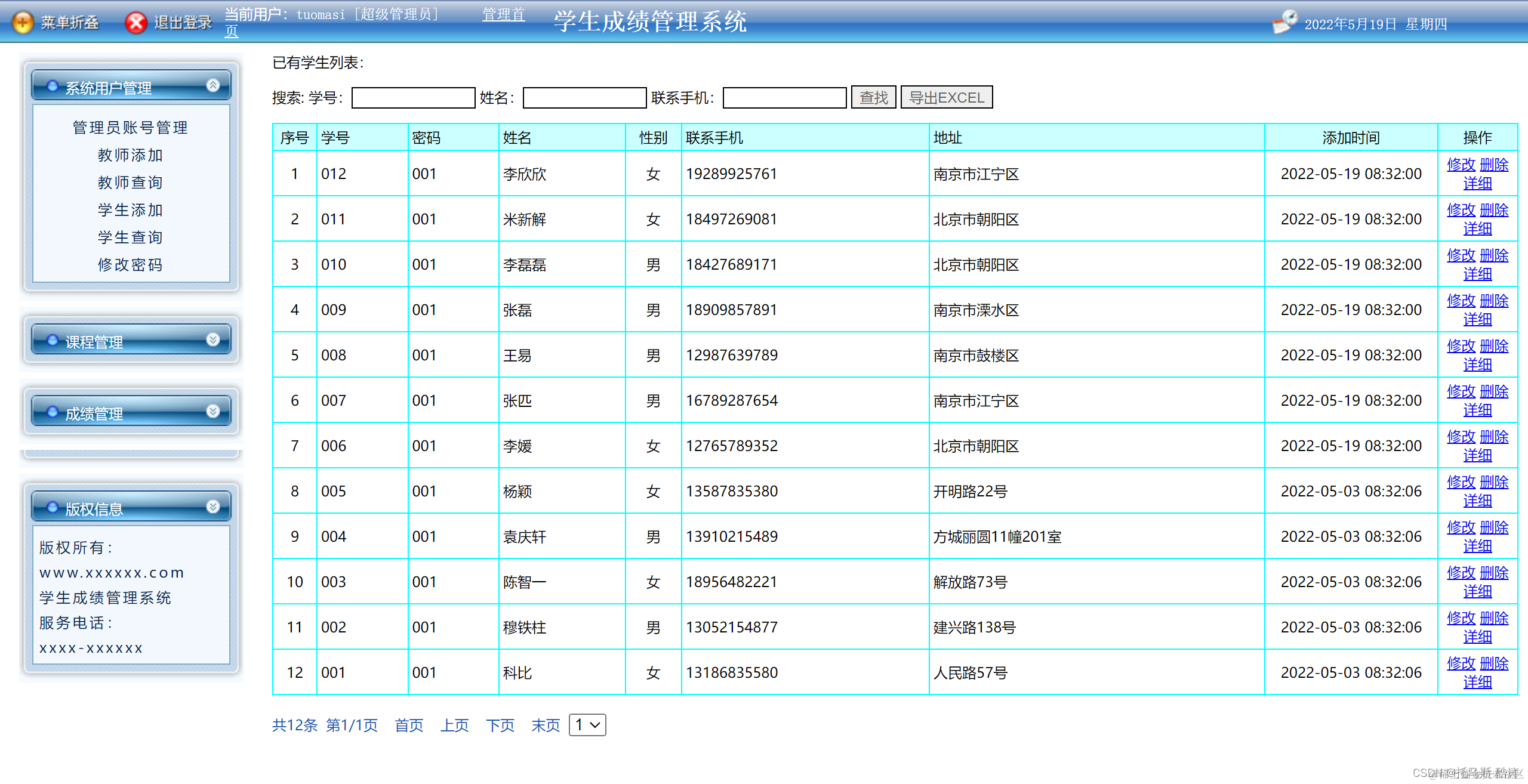 成绩管理:对学生成绩的curd,模糊查询,导出excel等操作。