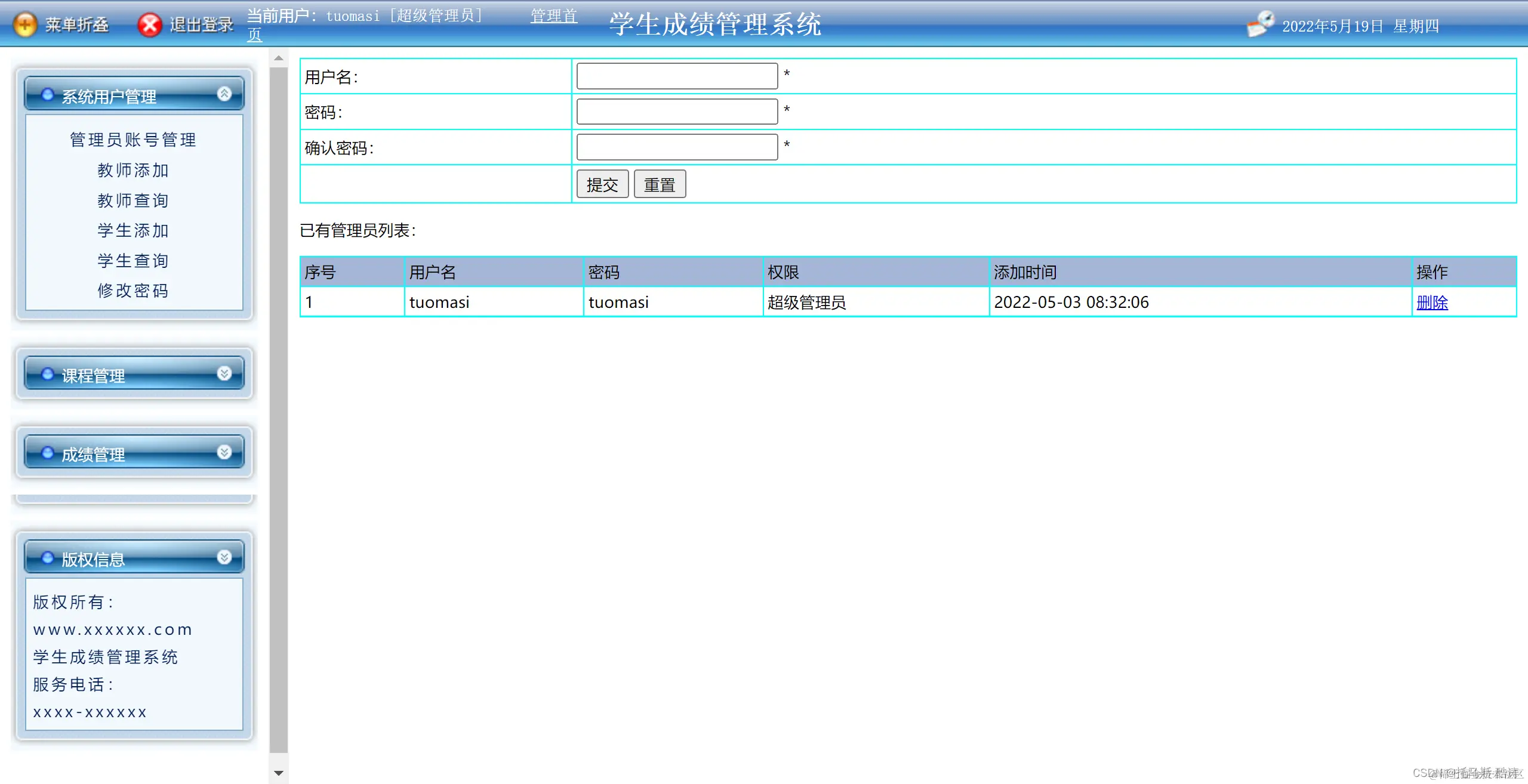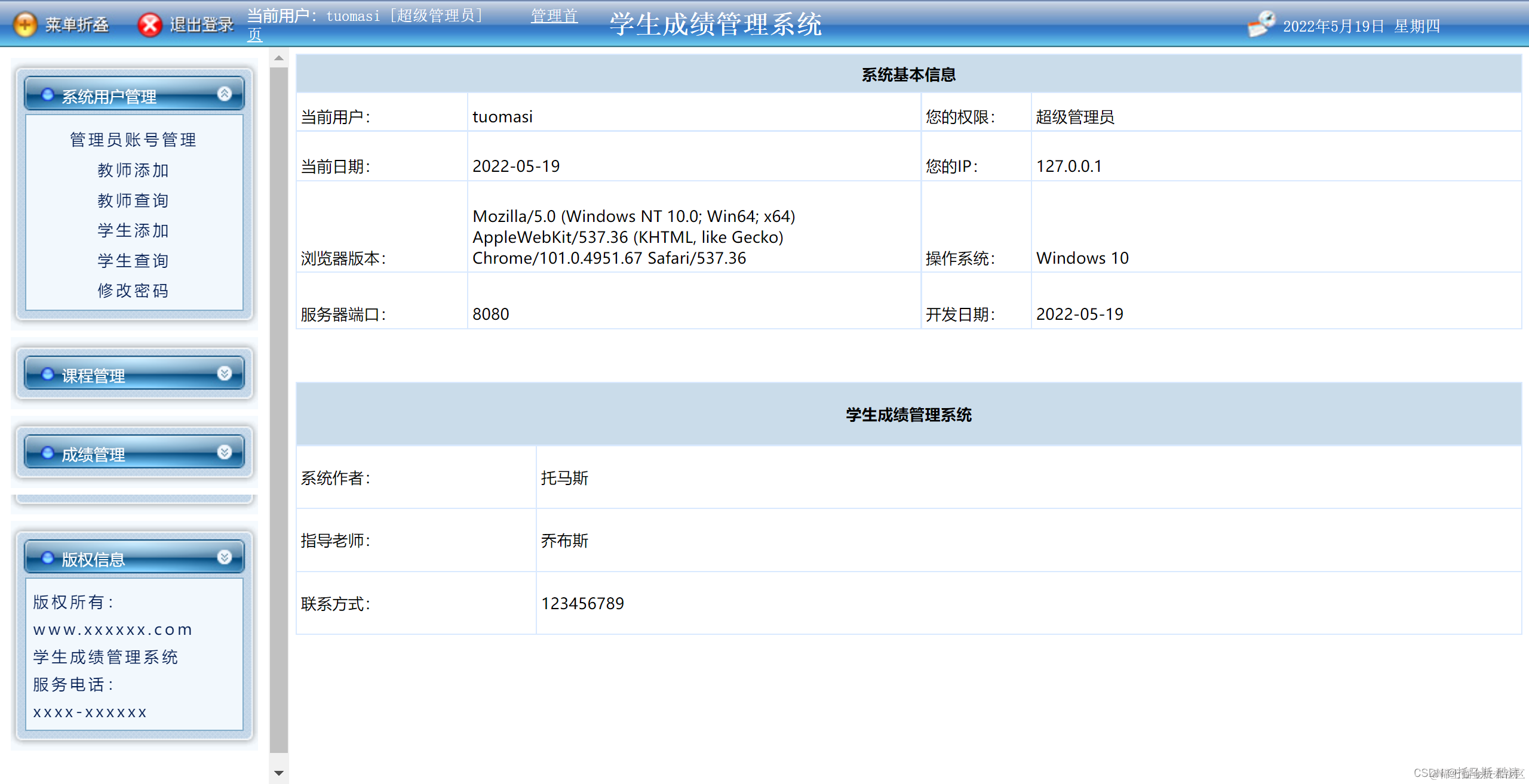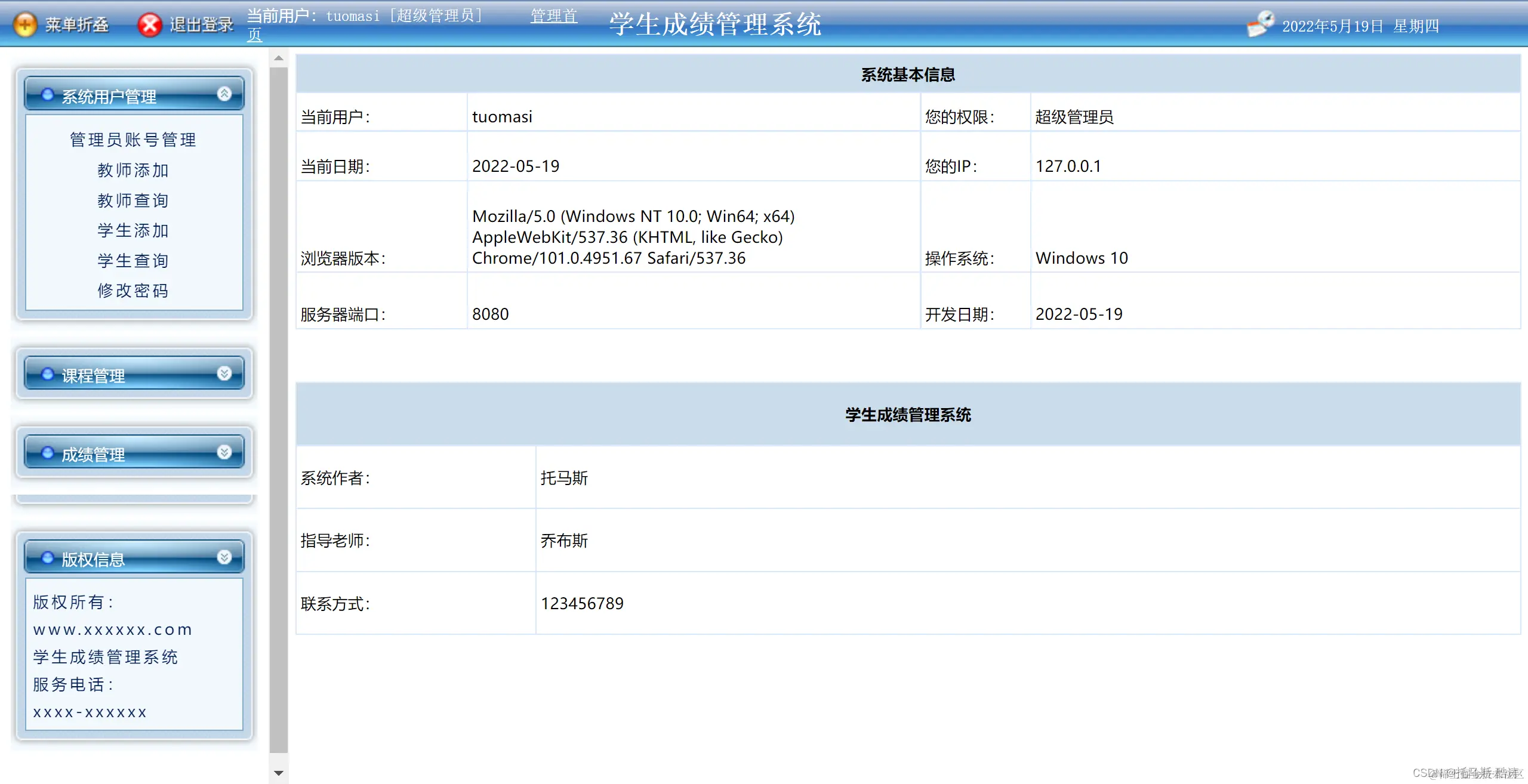 教师登录:教师有个人资料管理,学生管理,课程管理,成绩管理,,版权信息五大板块。