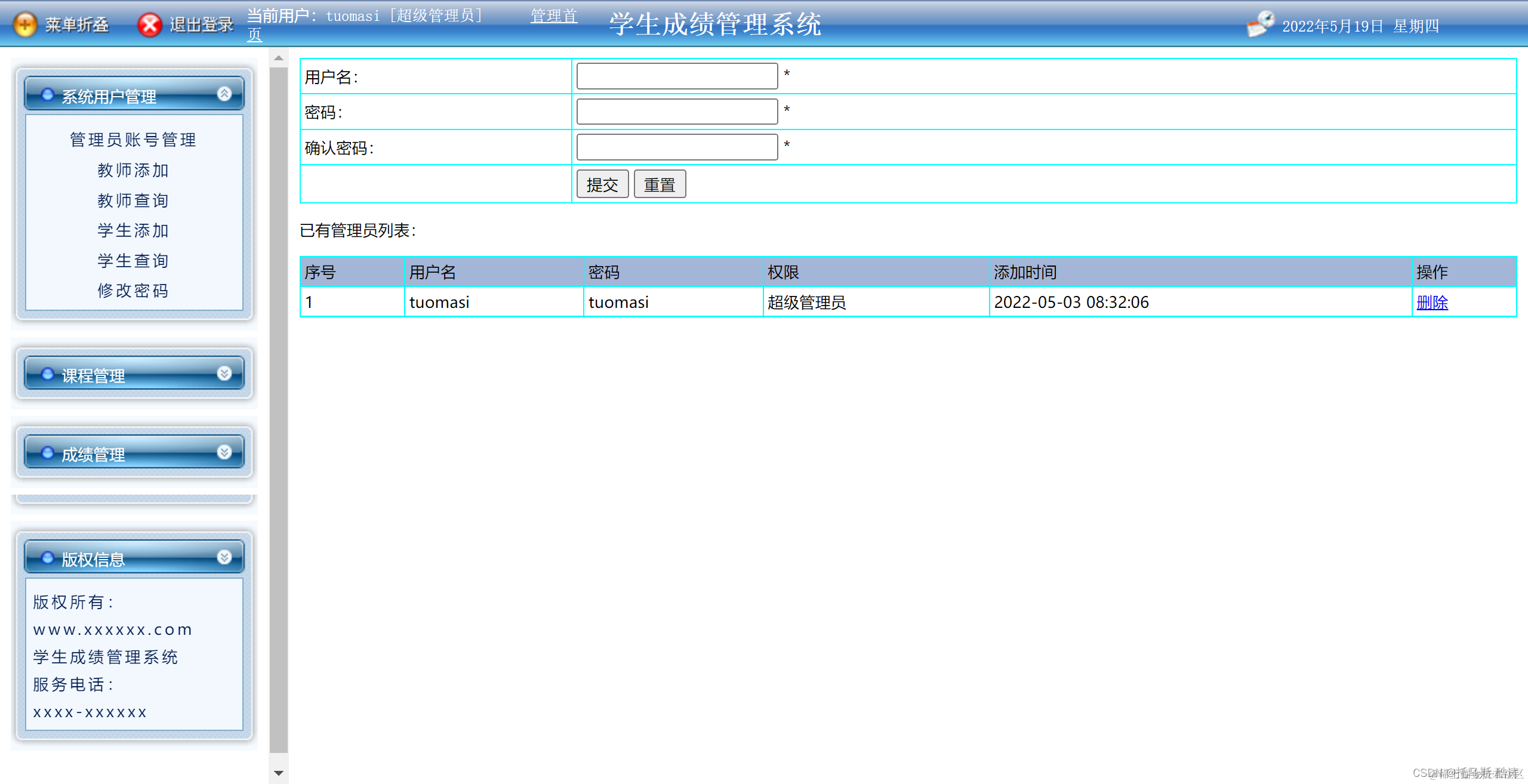 系统用户管理: 包含管理员账号管理,教师添加,教师查询,学生添加,学生查询,修改密码等模块。