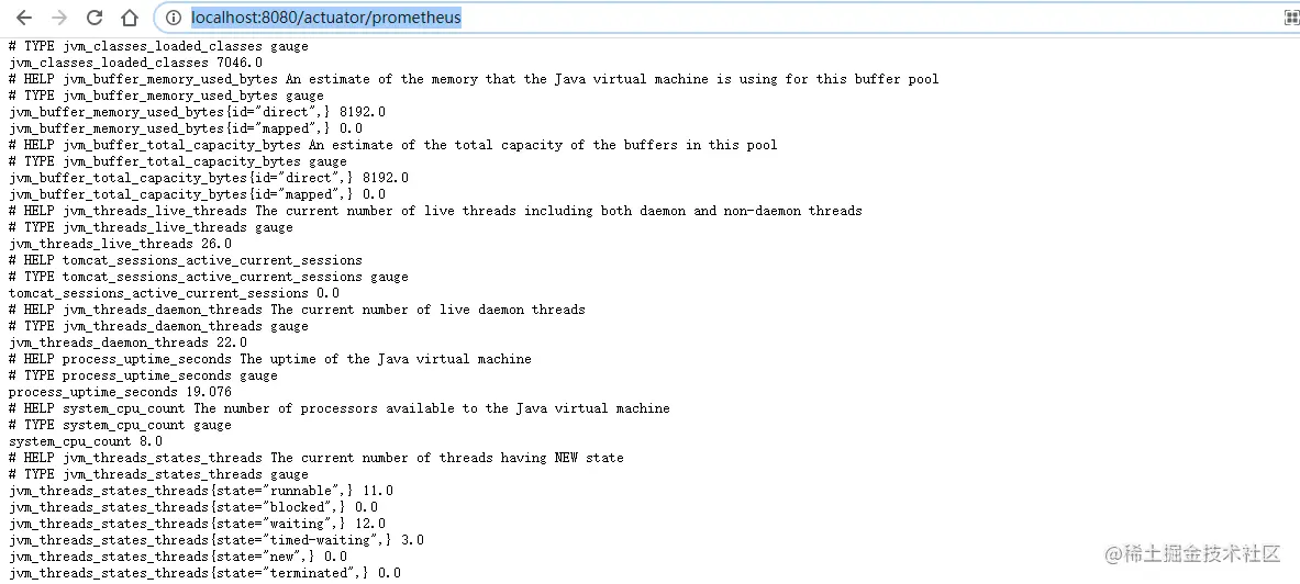 启动项目,浏览器访问 /actuator/prometheus 端点