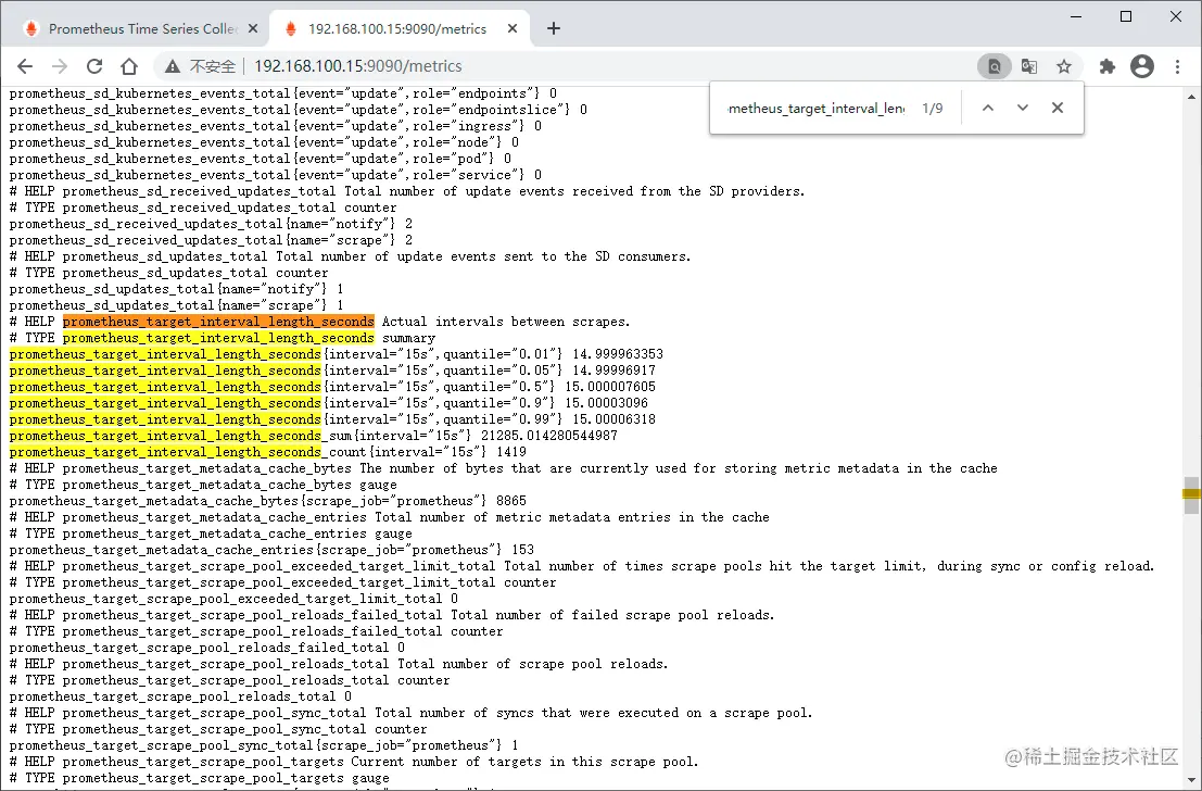 这应该返回多个不同的时间序列(以及每个序列的最新值),每个序列的指标名称均为prometheus_target_interval_length_seconds,但具有不同的标签。