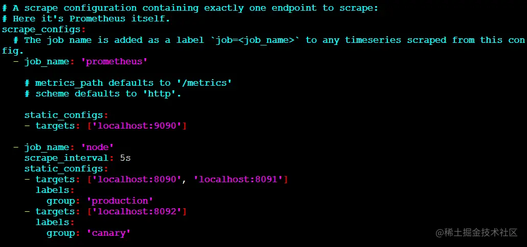 首先,定义一个名为'node'的作业,这个作业负责从这三个目标端点抓取数据。假设,想象前两个端点是生产环境的,另一个是非生产环境的,为了以示区别,我们将其打上两个不同的标签。在本示例中,我们将group="production"标签添加到第一个目标组,同时将group="canary"添加到第二个目标。