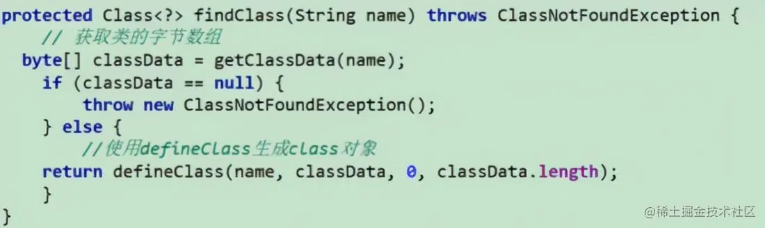 查找二进制的 name 类,返回该类的实例,这个类是 loadClass 内部调用的一个方法,JDK 维护了一个推荐的重写方法,鼓励我们去重写这个方法来实现对功能的拓展。JDK 1.2 之前还未引入父类委托机制,所以要拓展就需要去重写 loadClass 方法,1.2 引入父类委托机制后通过重写 findClass 方法来拓展,并且也没有破坏父类委托机制。