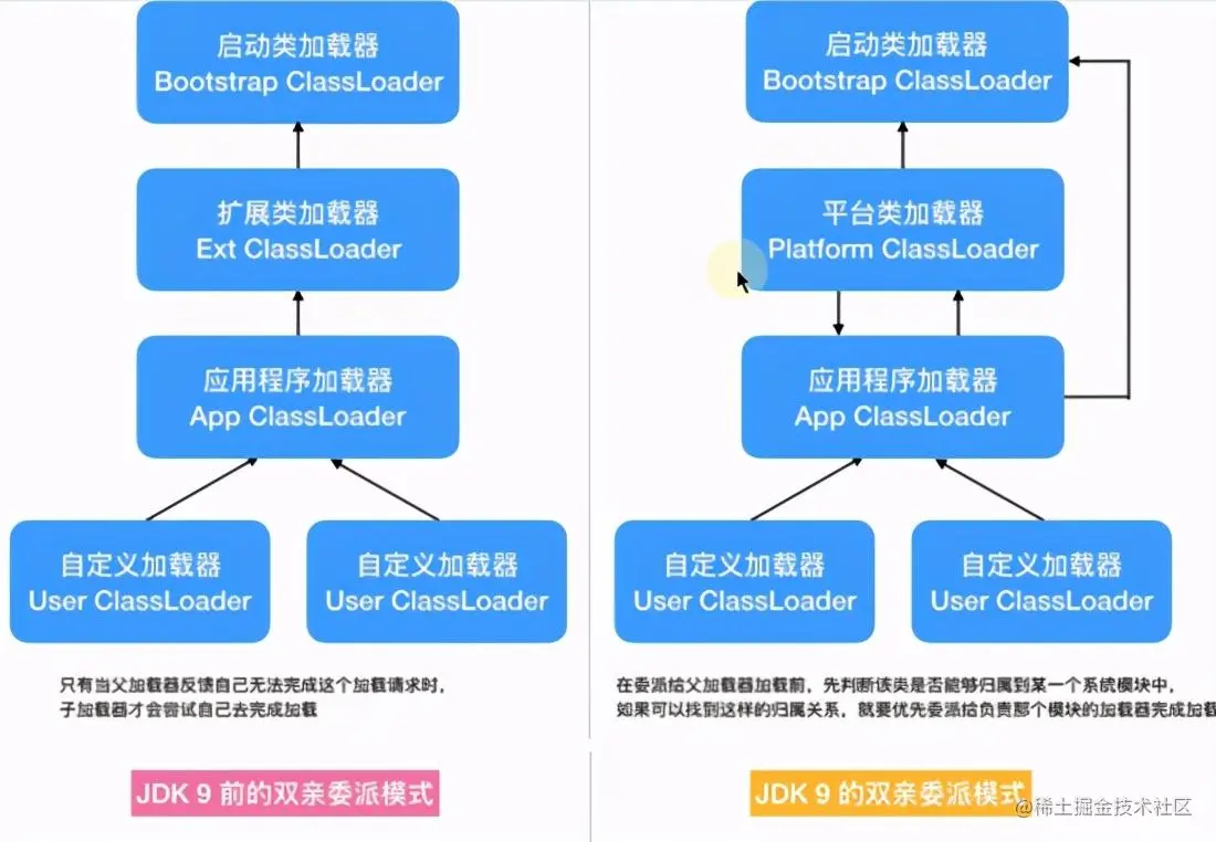6、委派机制变化。在加载器收到加载请求后,会先判断该类是否属于某个系统模块,如果属于直接将这个请求发给这个模块的类加载器。