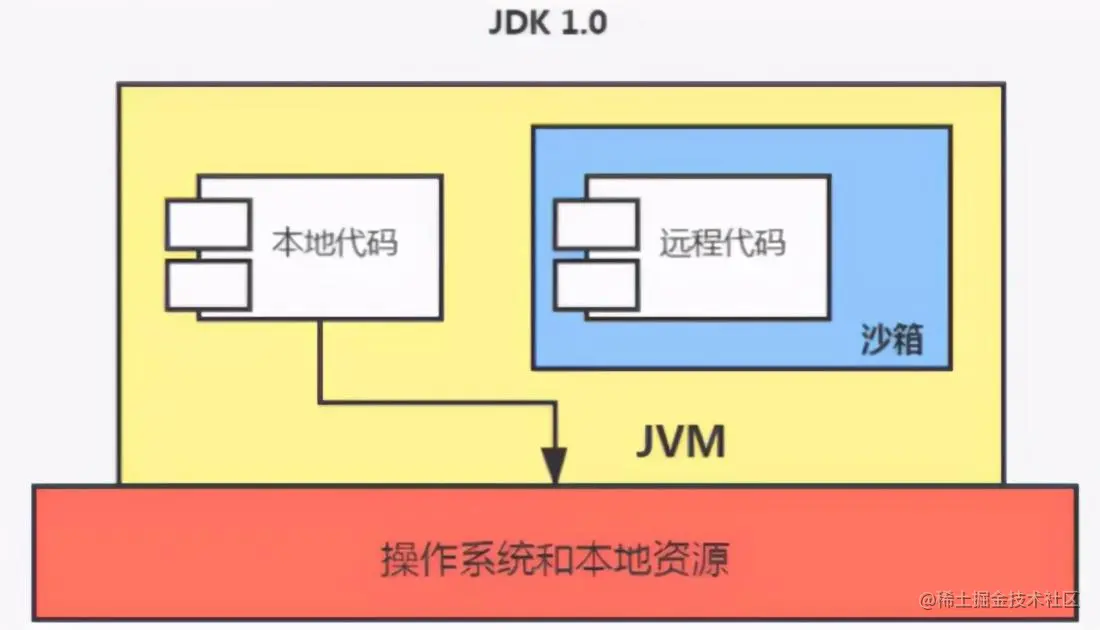 将执行的 Java 代码分为本地和远程两种,本地代码默认视为可信赖的,而远程代码则看作不受信赖的。对于信赖的代码,可以访问一切本地资源。而不受信赖的代码,则会受到沙箱的限制,不能访问本地资源。