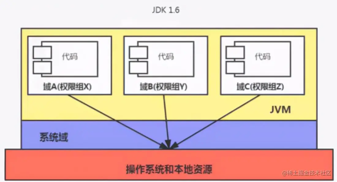 1.1 中无法解决的是本地代码权限问题,因为本地都是可以访问本地资源的,所以在 1.2 中又引入了 代码签名。 无论是本地代码还是远程代码,都会按照用户的安全策略设定,由类加载器加载到虚拟机中权限不同的运行空间,来实现差异化的代码执行权限控制。