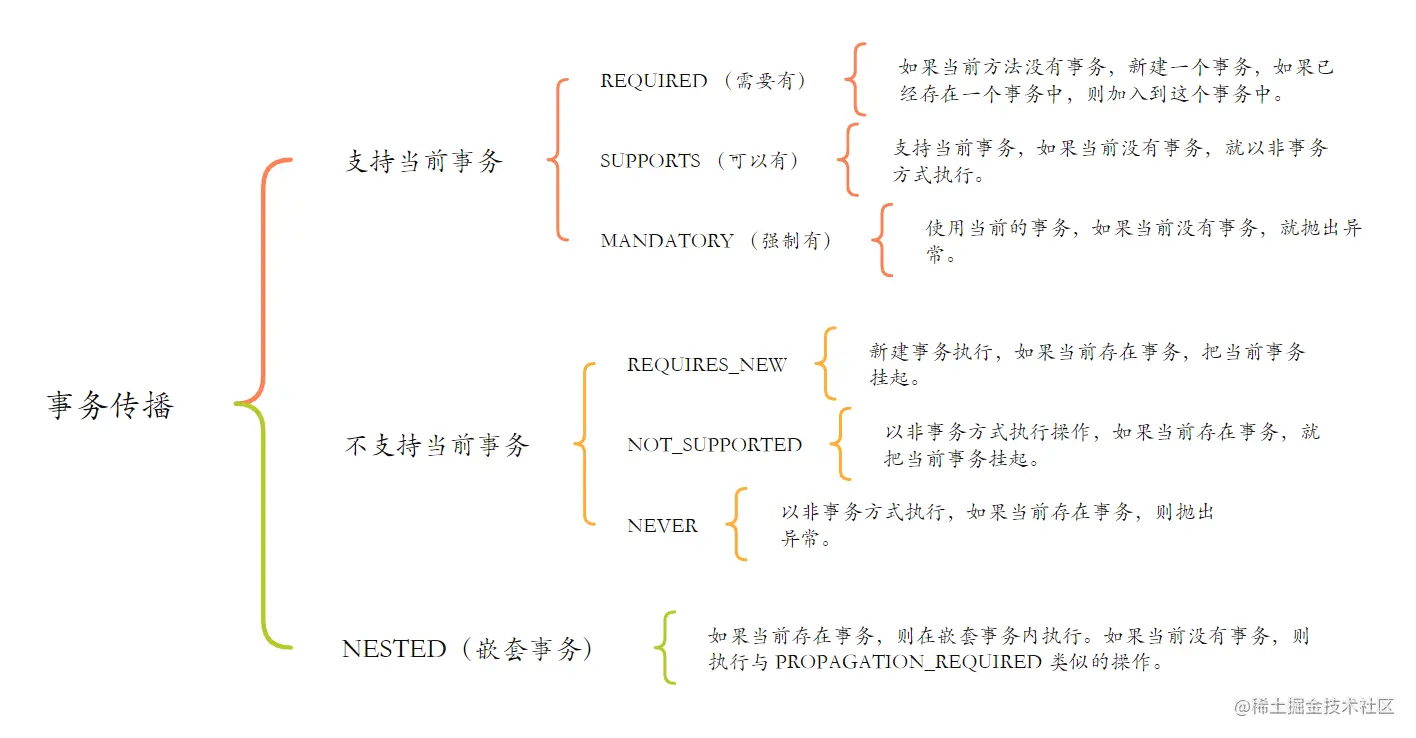 Spring 事务传播机制是指,包含多个事务的方法在相互调用时,事务是如何在这些方法间传播的,Spring 事务传播机制分为 3 大类,总共 7 种级别,如下图所示: