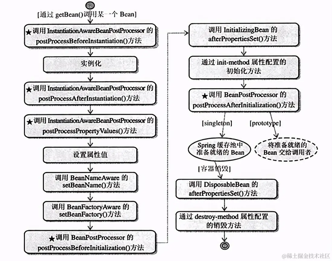 可以看到 bean 的加载是相当复杂的。加载的步骤大致如下: