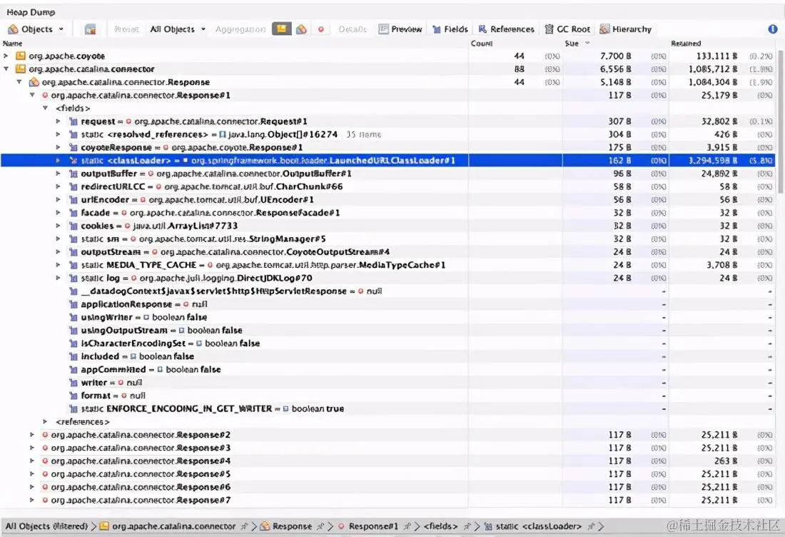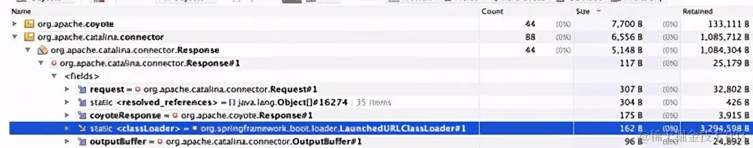 深入研究这个内存转储,我们发现堆上存储了44个响应对象,比初始转储中的响应对象要高得多。这44个响应对象实际上都存储了自己的 launchDurlClassLoader ,因为它位于一个单独的线程中。每个对象的保留内存大小都超过 3MiB 。