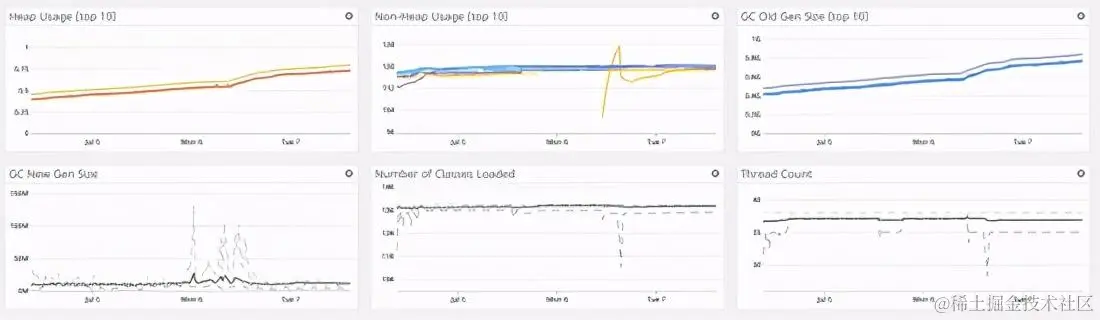 看看这个图,内存泄漏的唯一迹象是堆使用率和GC旧gen大小随着时间的推移而增长。当堆空间使用量达到1GiB时,运行Docker容器的Kubernetes pod就要被杀死了。每一个其他指标看起来都很稳定:线程数一直保持在略低于40的水平,加载的类的数量也很稳定,非堆的使用也很稳定。