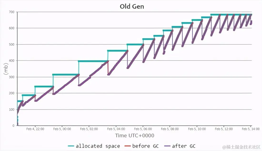 该图显示了旧的Gen内存(老年代对象)的内存模式。绿线显示分配的内存,紫色线显示GC对Old Gen memory执行扫描阶段后的实际内存使用量,垂直红线显示GC步骤前后内存使用量的差异。
