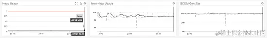 在这张图中,Y轴上的数字表示内存的GiBs。红线表示JVM可用于堆内存(1GiB)的绝对最大值。深灰色线表示一段时间内的平均实际堆使用量,灰色虚线表示随时间推移的最小和最大实际堆使用量。开头和结尾处的峰值表示应用程序被重新部署的时间,因此在本例中可以忽略它们。