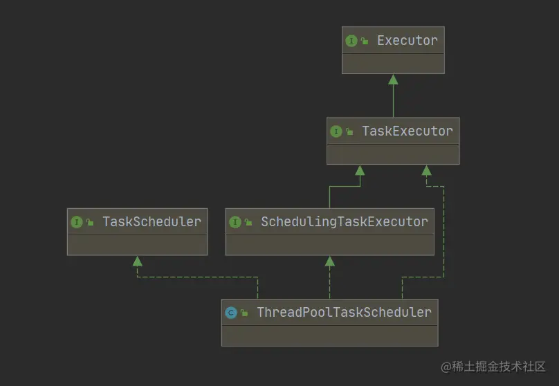 org.springframework.boot.autoconfigure.task.TaskSchedulingAutoConfiguration为我们默认注入了他们的实现:ThreadPoolTaskScheduler,本质上是ScheduledExecutorService 的封装,增强在调度时间上的功能。