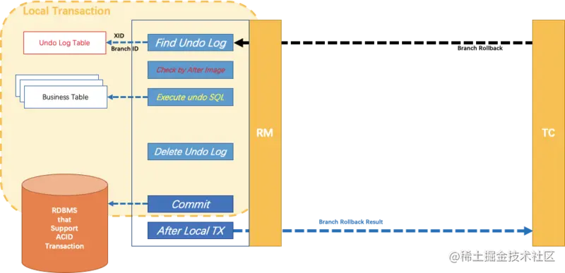 分布式事务操作失败,TM向TC发送回滚请求,RM 收到协调器TC发来的回滚请求,通过 XID 和 Branch ID 找到相应的回滚日志记录,通过回滚记录生成反向的更新 SQL 并执行,以完成分支的回滚。