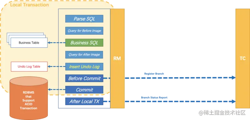 - RM 向 TC 注册分支事务,该分支事务归属于拥有相同 XID 的全局事务;