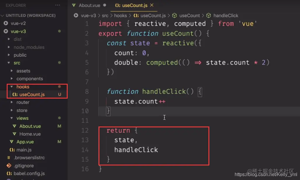 这样写,相信大家都有疑问,每一个函数都要这样return,不是代码相对原来更复杂了吗?其实这样做是为了做抽离的优化。可以将处理同一个逻辑的state和function 从 组件中抽离出去,这就是 compostion API 的优美所在。