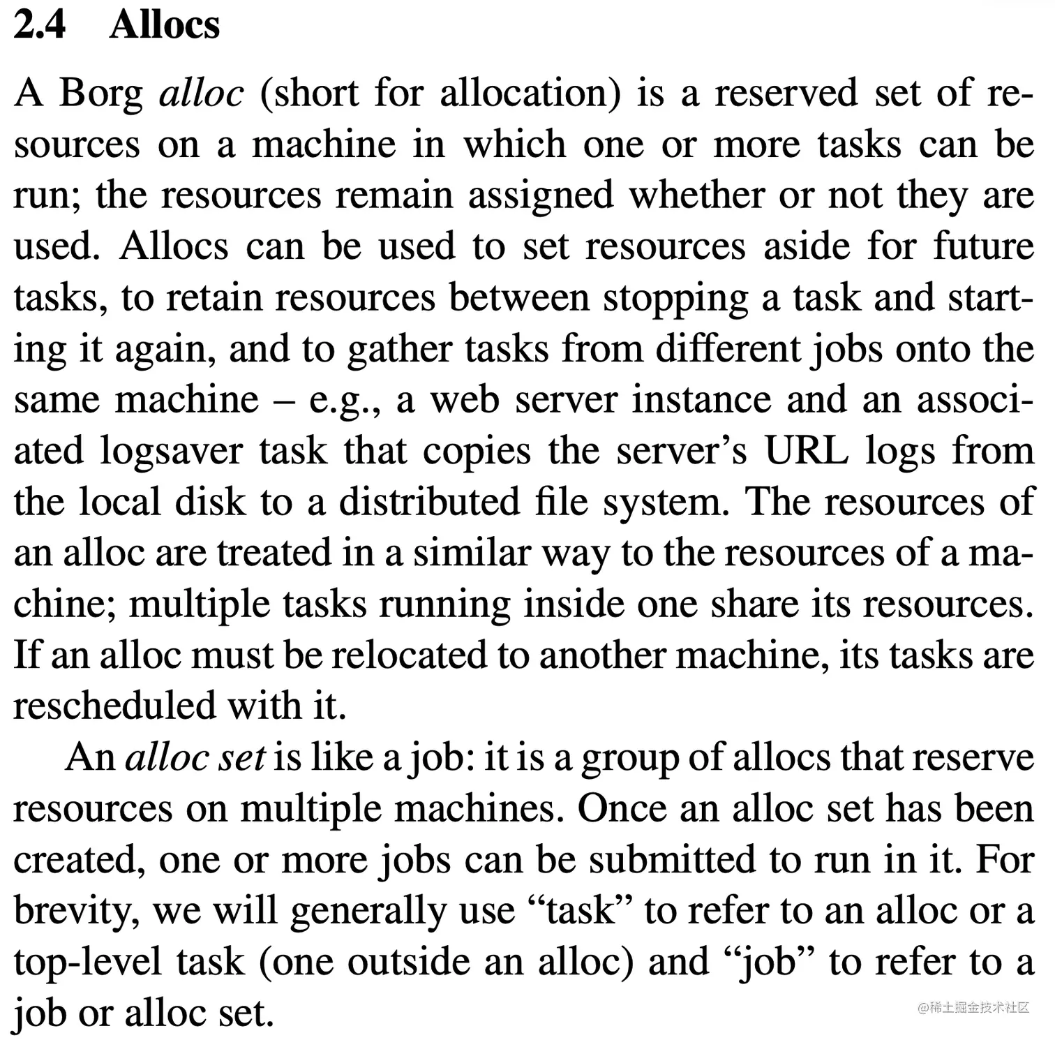 Borg分配(分配的缩写)是一台机器上可以运行一个或多个任务的资源的保留集。无论是否使用资源,资源都会保持分配状态。 Alloc可用于为将来的任务留出资源,在停止任务和重新启动任务之间保留资源,以及将来自不同作业的任务收集到同一台计算机上–例如,一个Web服务器实例和一个关联的logaver任务,用于复制服务器的URL日志从本地磁盘记录到分布式文件系统。分配资源与机器资源的处理方式相似。在一个内部运行的多个任务共享其资源。如果必须将分配重定位到另一台计算机,则其任务将随之重新安排。 分配集就像一项工作:它是一组在多台机器上保留资源的分配。创建分配集后,可以提交一个或多个作业以在其中运行。为简便起见,使用“任务”指代分配或顶级任务(在分配外的一个),使用“作业”来指代作业或分配集。
