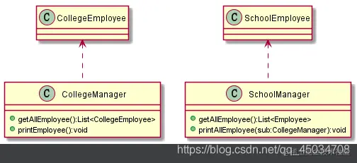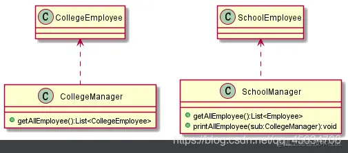 分析SchoolManager类,发现Employee和CollegeManager都是它的直接朋友(出现在参数和返回值中),但CollegeEmployee不是直接朋友,是以局部变量的形式,违背了迪米特原则。改进:避免依赖CollegeEmployee,封装在CollegeManager中,对外提供public方法即可。