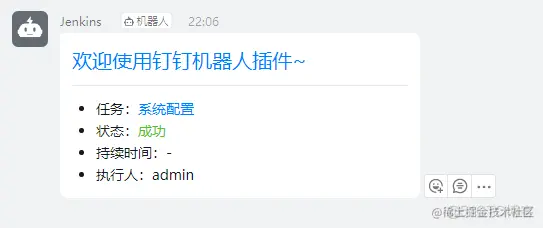 测试成功之后,在钉钉中会下发如下信息,也就表示我们在Jenkins中添加钉钉机器人的配置是成功的