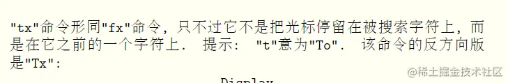 一个最有用的移动命令是单字符搜索命令. 命令"fx"在当前行上查