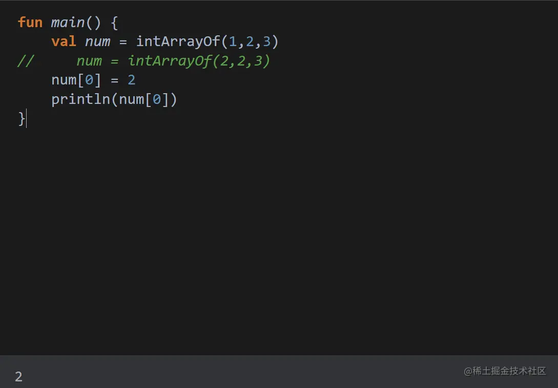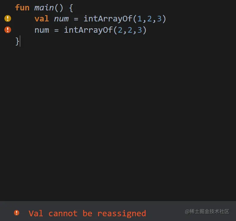 上述代码中,我们直接修改 val 类型的变量,给这个变量赋予新的数组。会出现报错,告知我们 val 类型不可重复赋值。但当我们修改代码如下,会发现数组的内容是可以修改的。