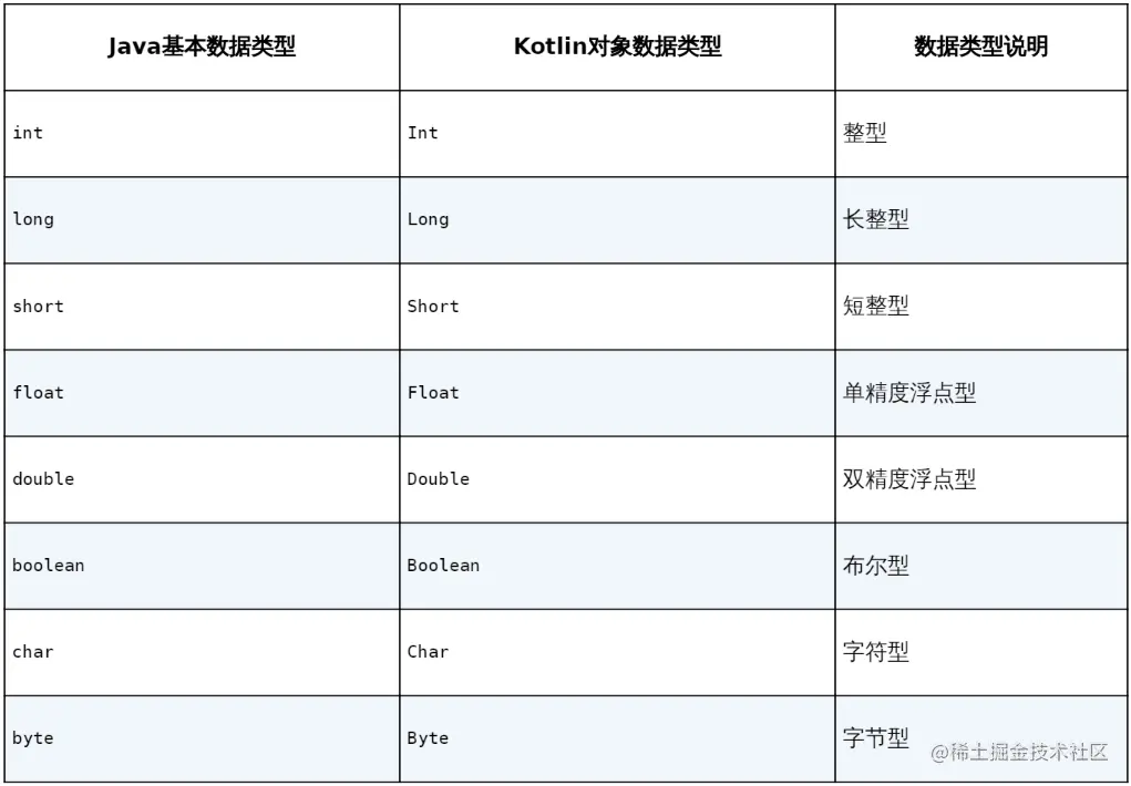 我们会发现 Java 中的 int 和 long 这里的首字母变成了大写。那是因为,kotlin 中不再有基本变量类型,全面转变为对象数据类型。下面给出对应的表格