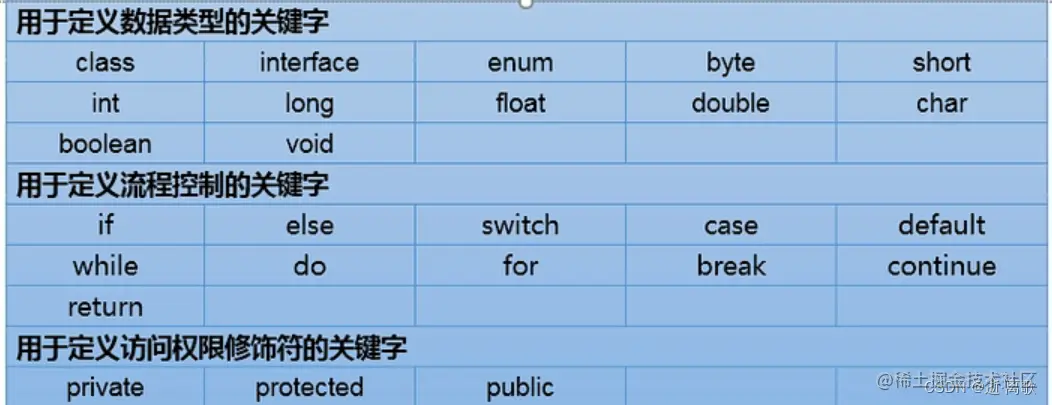 定义:被java语言赋予了特殊含义,用作专门用途的字符串