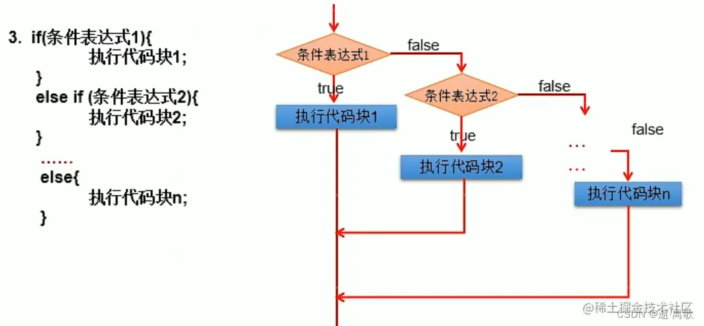 if (条件表达式){ 执行代码块1 }else if{ 执行代码块2 } ...... else{ 执行代码块n }