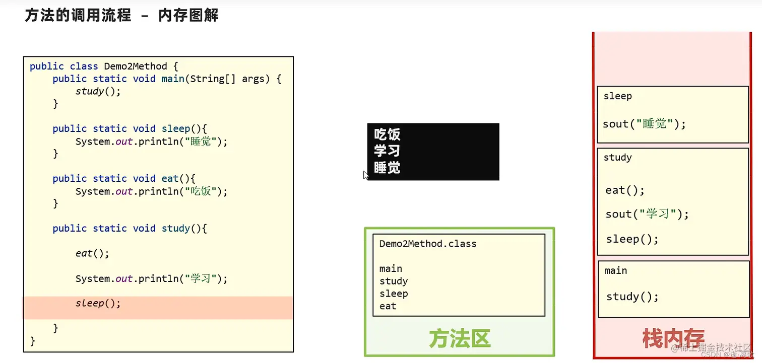 ⑨有返回值的方法调用时可以选择定义变量接受结果,或者直接输出调用,甚至直接调用;无返回值方法的调用只能调用一下。