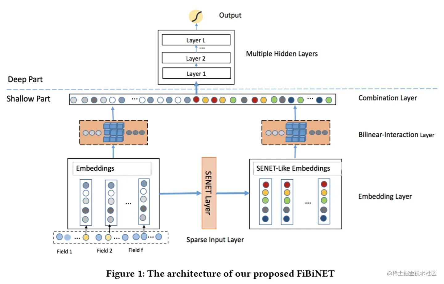 原始Embedding和调整权重后的Embedding在Bilinear-Interaction学习交互特征后,拼接成shallow 层,再经过全连接层来学习更高阶的特征交互。后面的属于常规操作这里就不再细说。